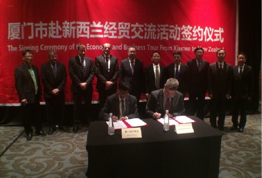 “廈門(mén)市赴新西蘭經(jīng)貿(mào)交流活動(dòng)”簽約儀式昨日在奧克蘭舉行。在市長(zhǎng)劉可清的見(jiàn)證下,國(guó)貿(mào)集團(tuán)董事長(zhǎng)何福龍與新西蘭合作伙伴現(xiàn)場(chǎng)進(jìn)行簽約。
