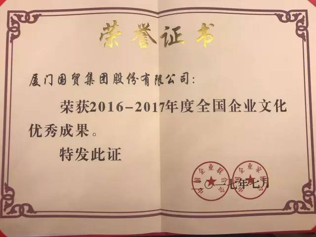7月22日,在2017全國企業(yè)文化年會上,中國企業(yè)聯(lián)會會、中國企業(yè)家聯(lián)合會表彰了2016-2017年度全國企業(yè)文化建設(shè)突出貢獻(xiàn)人物、全國企業(yè)文化優(yōu)秀案例和全國企業(yè)文化優(yōu)秀成果。廈門國貿(mào)作為廈門地區(qū)唯一的代表獲得了全國企業(yè)文化優(yōu)秀成果獎。