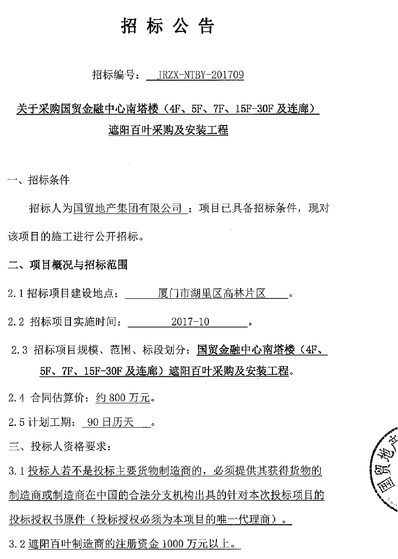 國貿(mào)金融中心南塔樓(4F、5F、7F、15F~30F及連廊)遮陽百葉采購及安裝工程