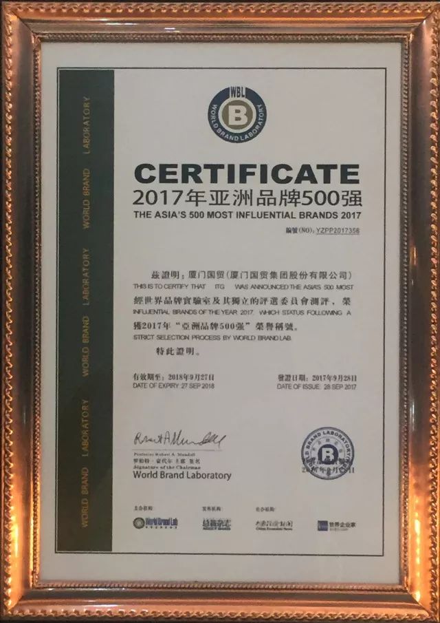 由世界品牌實(shí)驗(yàn)室和世界經(jīng)理人集團(tuán)共同編制和發(fā)布的2017年《亞洲品牌500強(qiáng)》排行榜于9月28日在香港揭曉, 這是世界品牌實(shí)驗(yàn)室第十二次對(duì)亞洲品牌的影響力進(jìn)行的測(cè)評(píng), 共有20個(gè)國(guó)家和地區(qū)的500個(gè)品牌入選。本年度《亞洲品牌500強(qiáng)》排行榜中,共有來(lái)自金融、食品飲料、電子電器、傳媒、通信電子IT等在內(nèi)的37個(gè)相關(guān)行業(yè)的品牌入選。廈門國(guó)貿(mào)集團(tuán)股份有限公司首次進(jìn)入這個(gè)榜單,位列本次亞洲品牌500強(qiáng)榜單第358位。