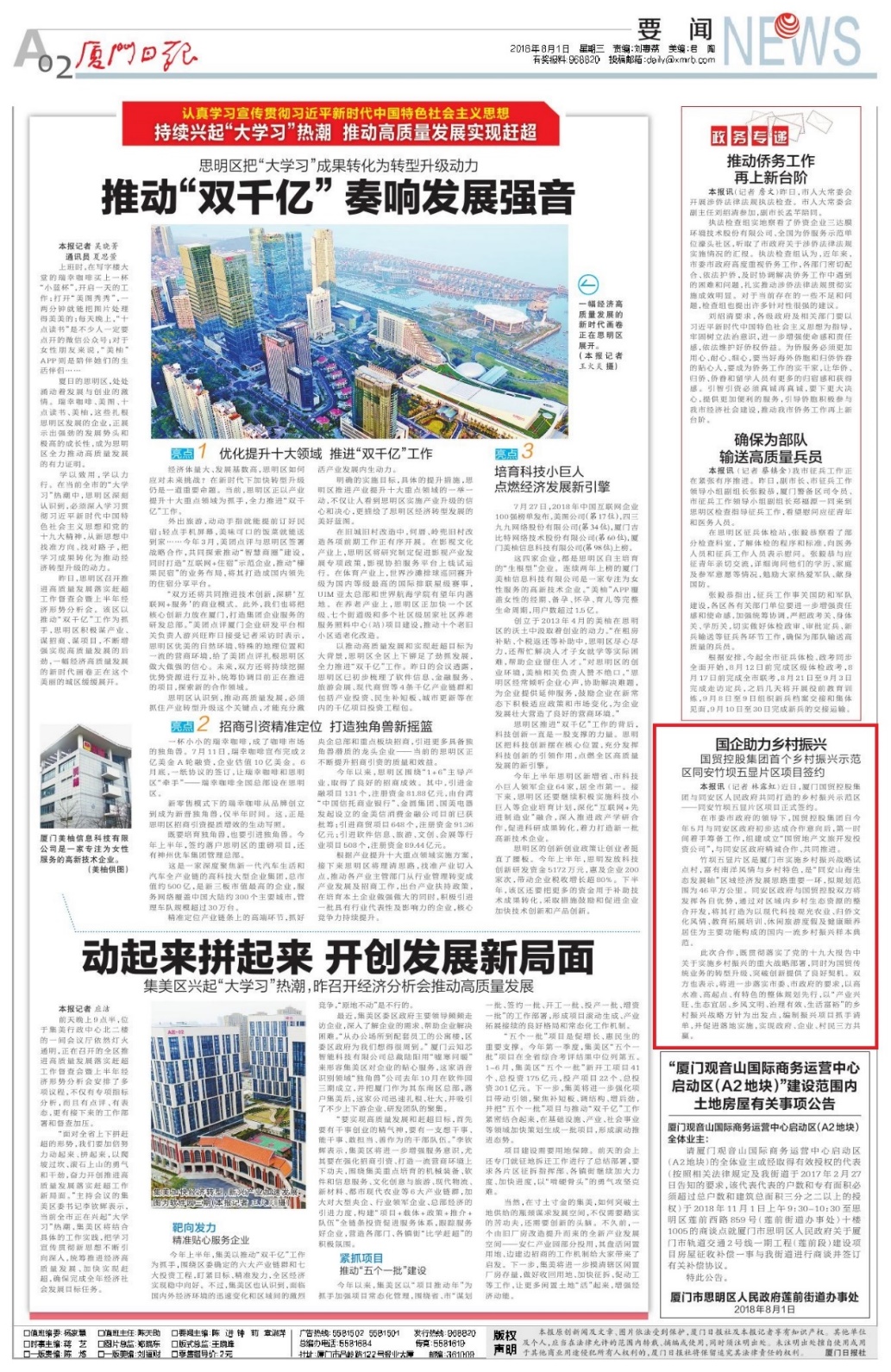 8月1日,廈門日報專題報道了《國企助力鄉(xiāng)村振興——國貿(mào)控股集團(tuán)首個鄉(xiāng)村振興示范區(qū)同安竹壩五顯項目正式簽約》。