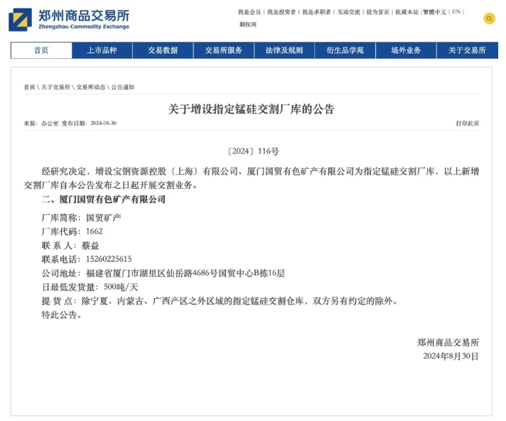 國(guó)貿(mào)有色礦產(chǎn)獲批鄭商所錳硅交割廠庫(kù)資質(zhì)