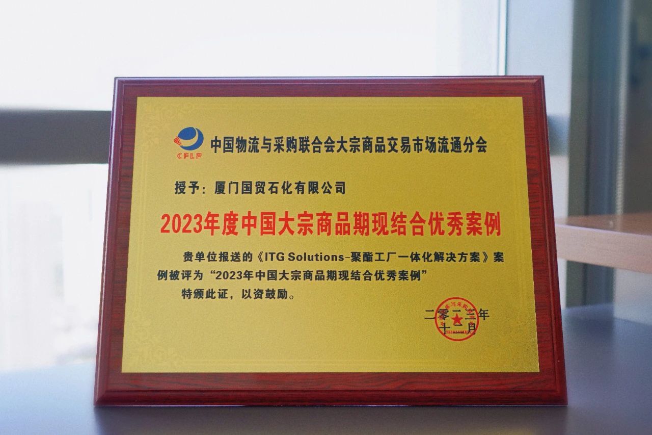 國(guó)貿(mào)股份旗下廈門國(guó)貿(mào)石化有限公司(下稱“國(guó)貿(mào)石化”)憑借 ITG Solutions 產(chǎn)業(yè)綜合服務(wù)在聚酯行業(yè)的創(chuàng)新應(yīng)用,榮獲“2023中國(guó)大宗商品期現(xiàn)結(jié)合優(yōu)秀案例”稱號(hào)。
