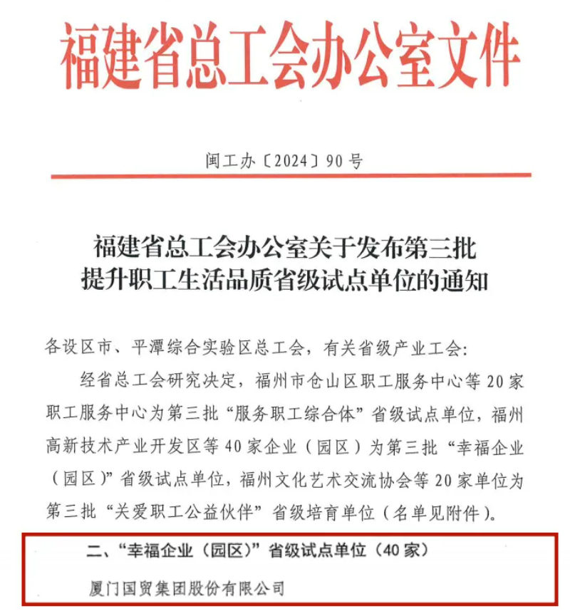 國(guó)貿(mào)股份入選福建省“幸福企業(yè)(園區(qū))”省級(jí)試點(diǎn)單位。