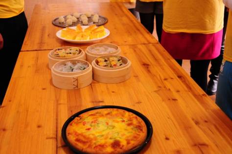 到了實(shí)踐環(huán)節(jié),學(xué)員們個(gè)個(gè)躍躍欲試,一開始粗糙的技術(shù)隨著練習(xí)不斷地進(jìn)步,雖然無法與老師們比肩,也算是有模有樣。不一會(huì)兒,餃子和包子便上籠開蒸,烤箱里傳出蛋糕、餅干和披薩的香味,令人垂涎欲滴。
