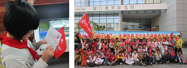 2011年10月,廈門國貿(mào)集團“愛與夢飛翔”志愿者帶領(lǐng)廈門市文安小學學生參觀廈門規(guī)劃展覽館。在規(guī)劃展講解員的帶領(lǐng)下,學生們親身感受了廈門的發(fā)展,體驗有趣的環(huán)形影院和各式各樣的最新科技,實實在在的了解了每天生活的城市,通過感受特區(qū)發(fā)展,也加深了他們對生活的熱愛,激勵學生懷抱建設(shè)家園的夢想,積極向上。