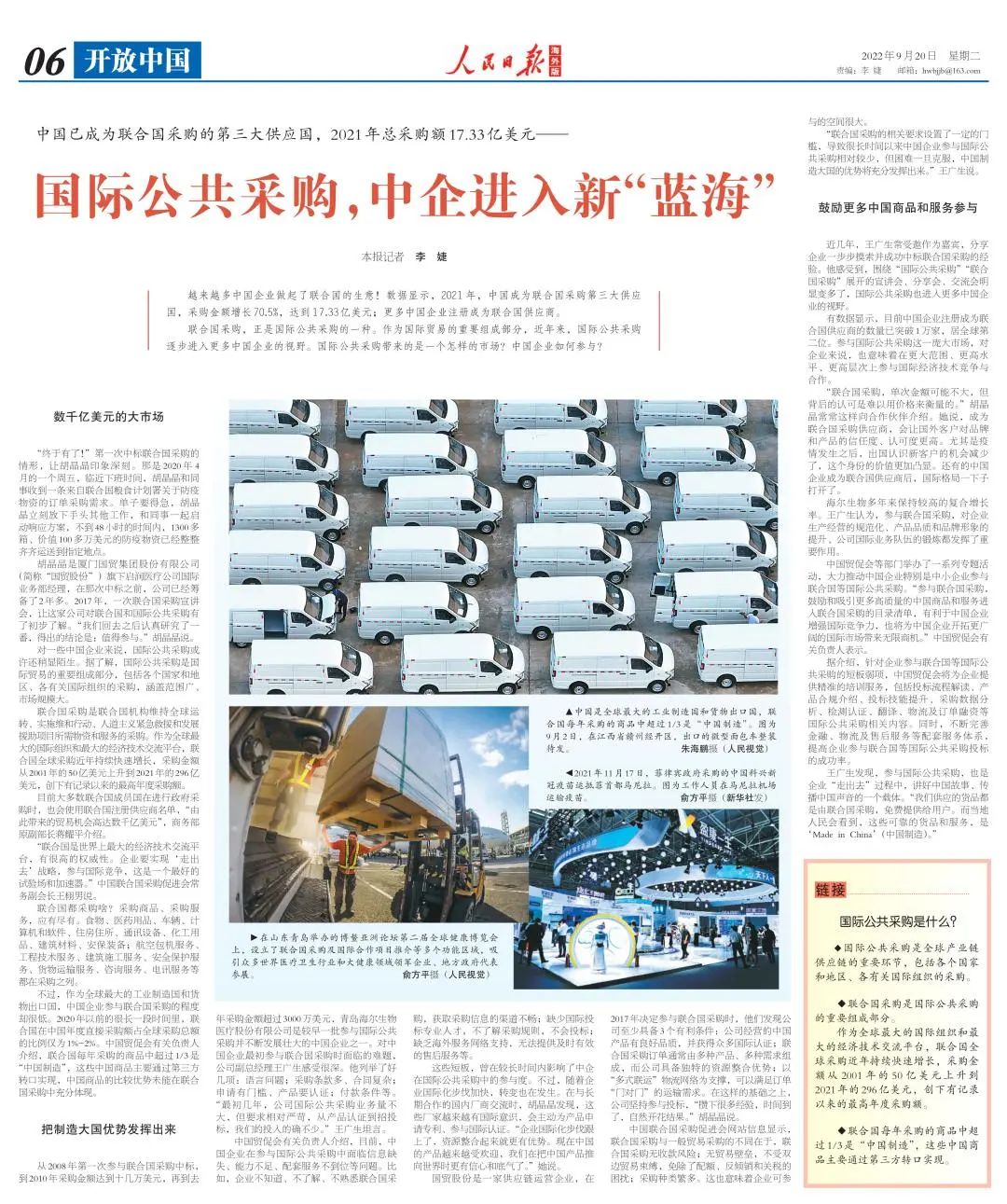 《人民日報(bào)》(海外版)刊發(fā)《國際公共采購,中企進(jìn)入新“藍(lán)?!薄芬晃?,采訪國貿(mào)股份旗下啟潤醫(yī)療公司國際業(yè)務(wù)部副總經(jīng)理(主持工作)胡晶晶,并以國貿(mào)股份為例,展現(xiàn)國際公共采購的潛在市場與貿(mào)易機(jī)遇。