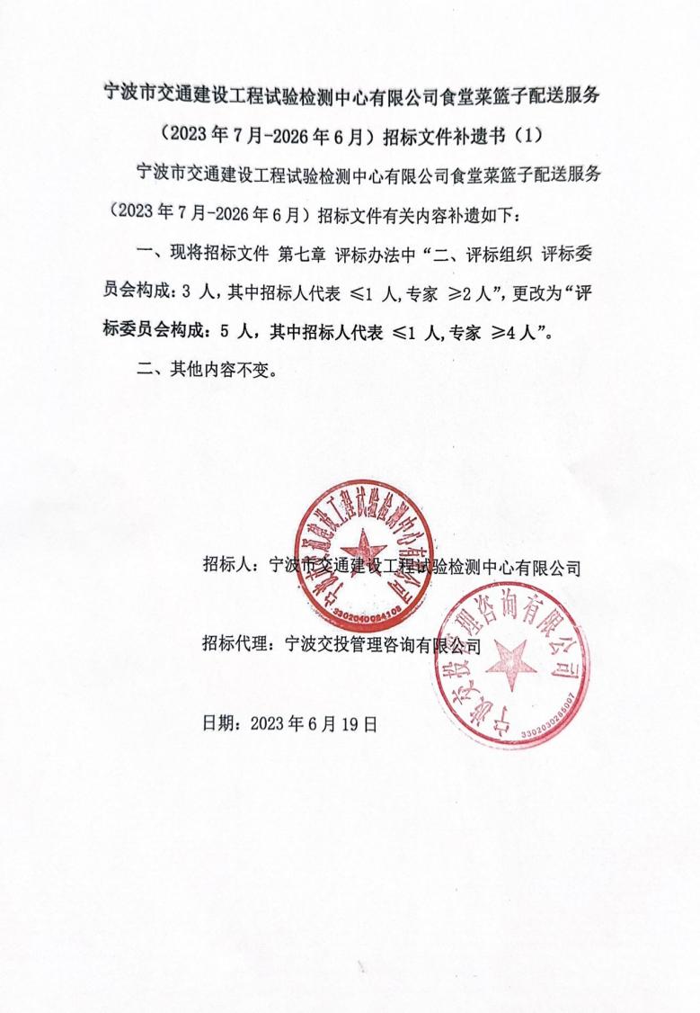 寧波市交通建設(shè)工程試驗檢測中心有限公司食堂菜籃子配送服務(wù)(2023年7月-2026年6月)招標文件補遺書(1)