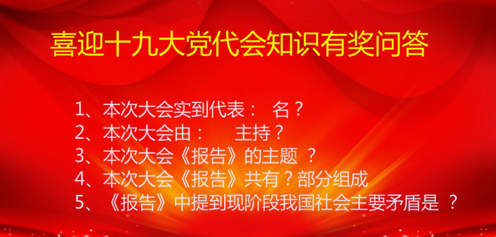 黨的十九大是我國(guó)全面建成小康社會(huì)決勝階段、中國(guó)特色社會(huì)主義發(fā)展關(guān)鍵時(shí)期召開(kāi)的一次十分重要的大會(huì)。為了提高公司黨員學(xué)習(xí)積極性擴(kuò)大參與度共同學(xué)習(xí)領(lǐng)會(huì)十九大會(huì)議精神,公司黨總支積極組織十九大會(huì)議期間每日知識(shí)有獎(jiǎng)問(wèn)答活動(dòng)。
