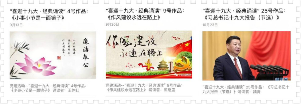 公司黨總支自9月中旬開(kāi)始,在公司自主開(kāi)發(fā)的微信公眾號(hào)推送“喜迎十九大·經(jīng)典誦讀”活動(dòng)。每日推送一名黨員同志朗誦的習(xí)近平系列講話等經(jīng)典作品,并在公司“紅色根據(jù)地”黨員微信群和QQ群中組織黨員對(duì)所誦讀內(nèi)容進(jìn)行討論?;顒?dòng)極大地激發(fā)了黨員干部們學(xué)理論、用理論的熱情。大會(huì)召開(kāi)期間,十九大報(bào)告原文更是成了黨員們首選的誦讀作品。